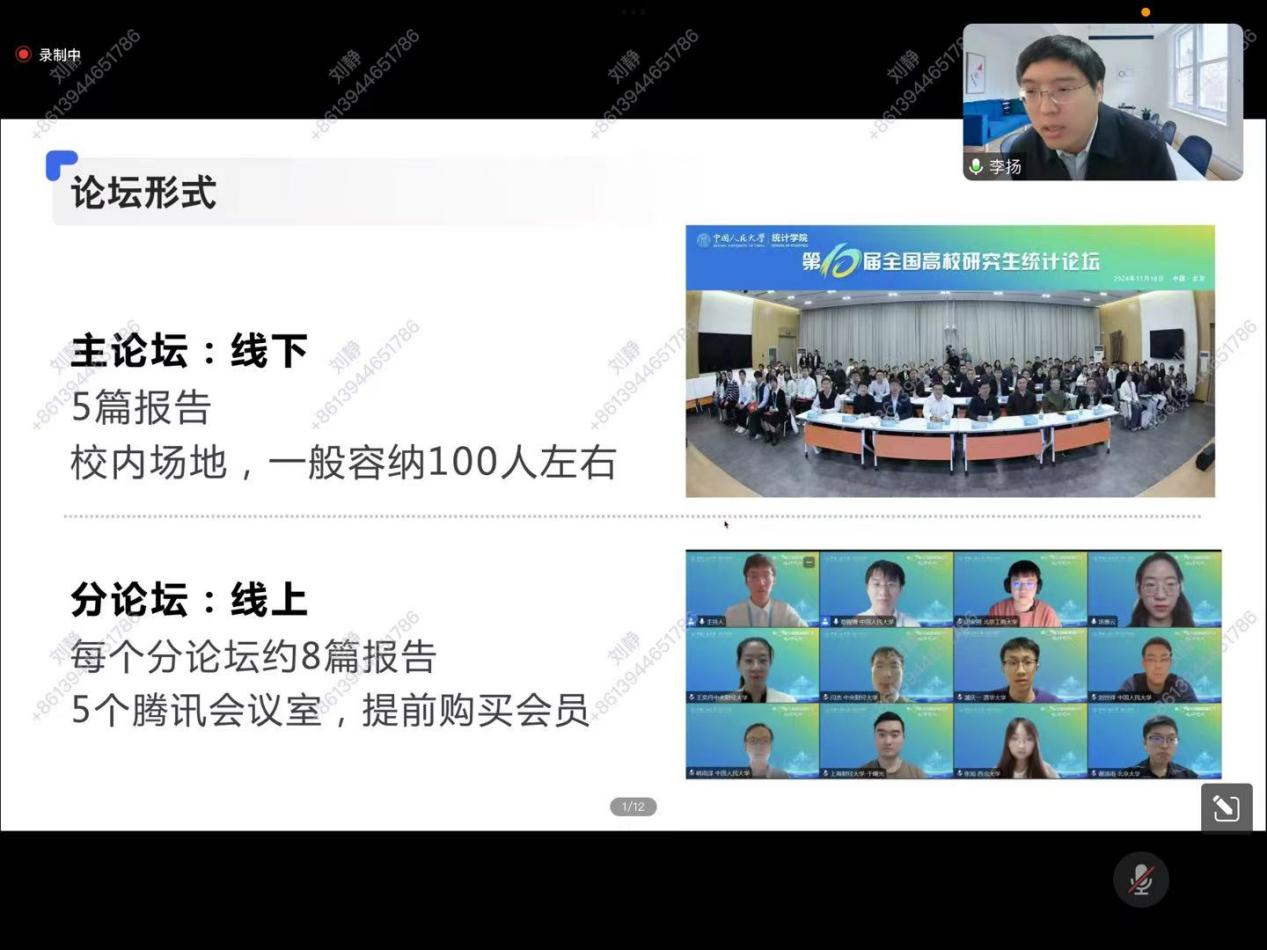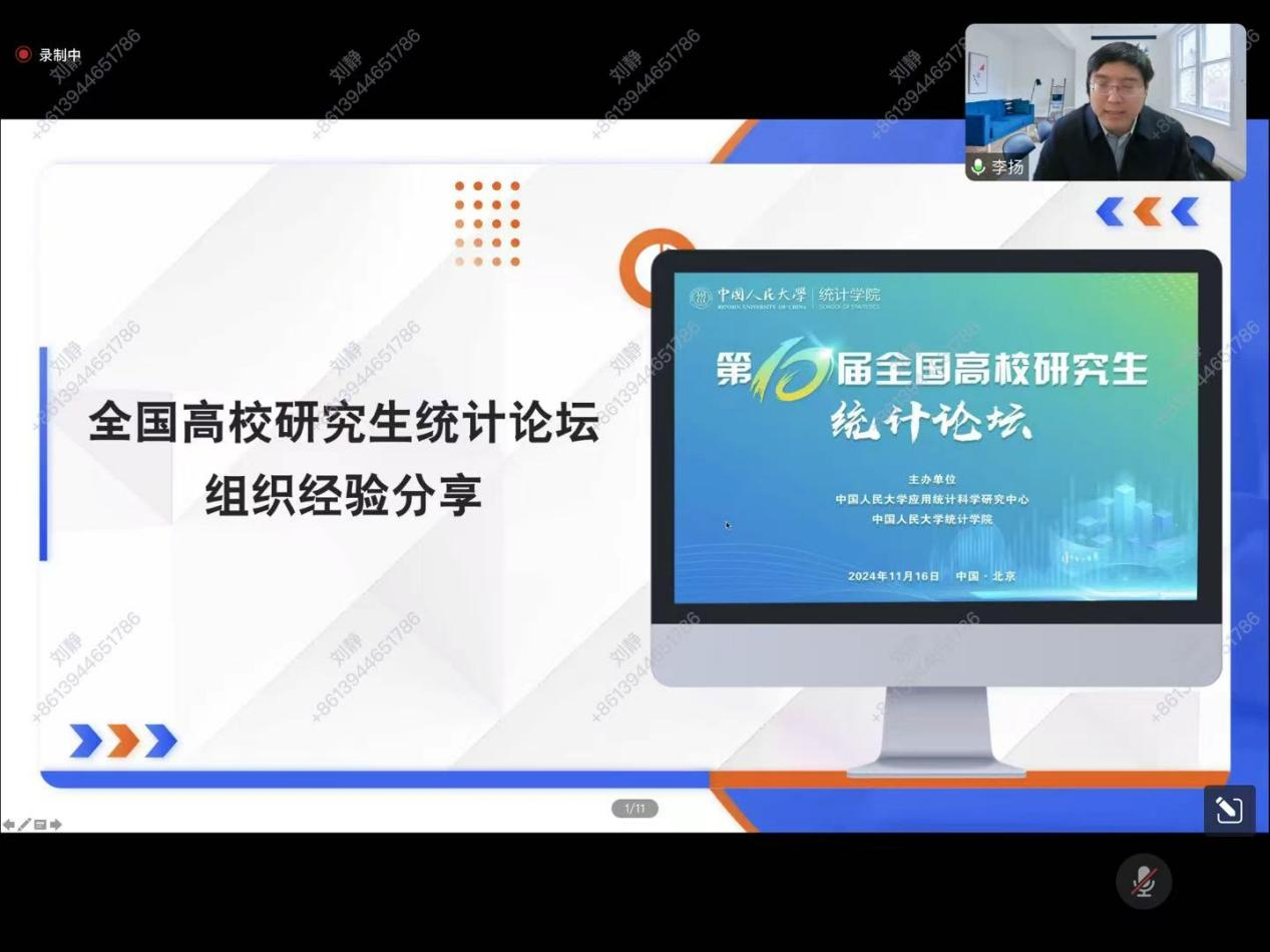 报告题目:本次学术报告由中国人民大学统计学院李扬教授主讲,主题为“全国高校研究生统计论坛组织经验分享”。