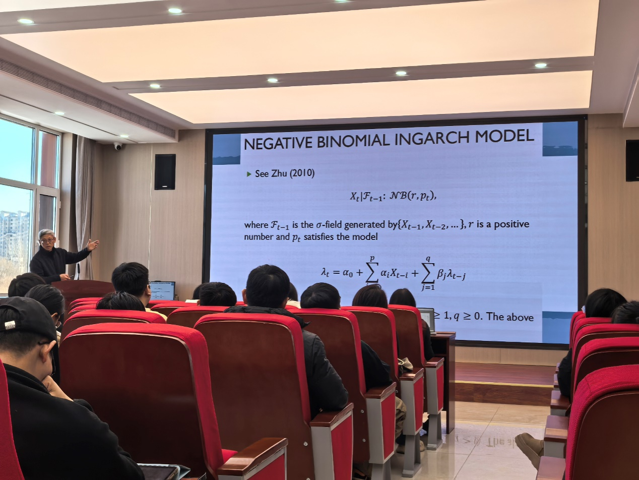 之后,刘双喆教授具体讲解了INGARCH (1,1)模型:它是经典GARCH模型的适配版本,专门用于分析日度交易数、传染病病例数这类离散型时间序列数据。这个模型中,某一期的观测结果会基于前一期的已有信息呈现特定分布;而描述这一分布的核心强度指标,是由基础常数项、前一期的观测结果,以及前一期的强度指标共同决定的。刘教授指出,这些信息都来自由过往观测与强度数据构成的信息集合,模型里的参数还得满足非负等条件,才能保证实际应用中的合理性,这也为后续诊断方法的设计明确了模型前提。