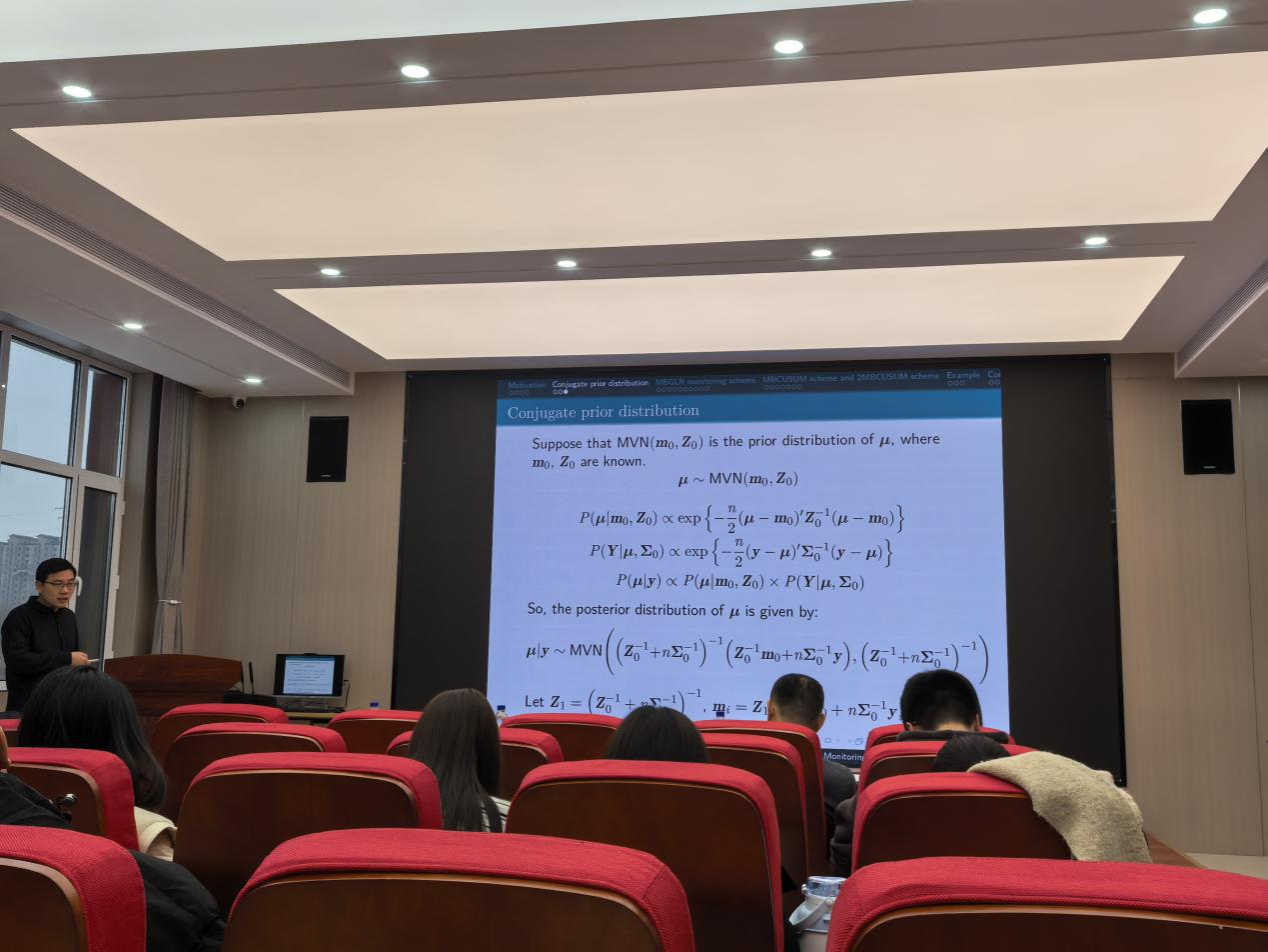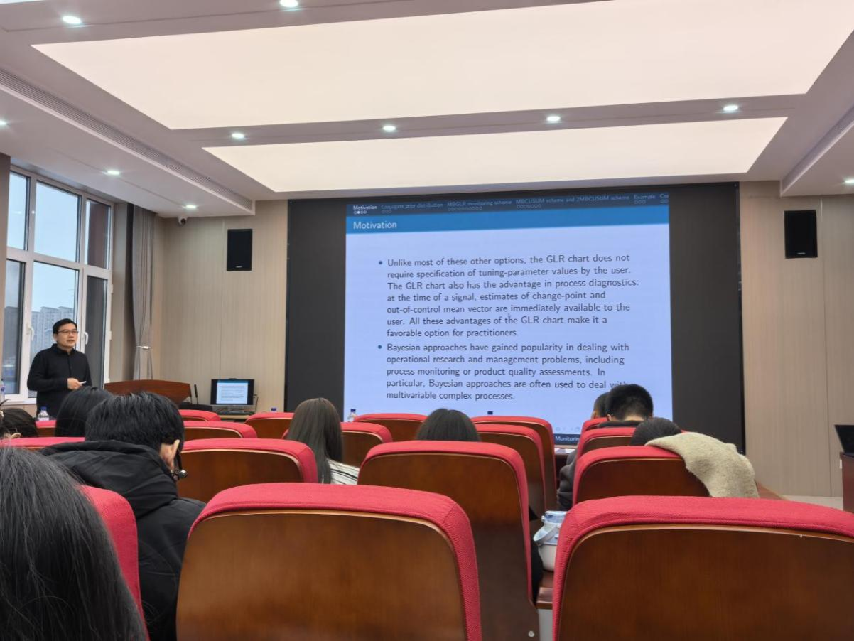 报告伊始,张教授聚焦统计过程监控工具展开说明:GLR 控制图区别于多数同类方案,无需用户手动设定调优参数,还具备过程诊断的实用优势 —— 在信号触发的同时,就能直接给出变点、失控均值向量的估计结果,这些特性让它成为从业者青睐的工具。同时,张教授指出:贝叶斯方法近年在运筹管理领域快速普及,常被用于解决过程监控、产品质量评估等实际问题;尤其在多元复杂过程的分析中,贝叶斯方法的适配性与处理能力更为突出。