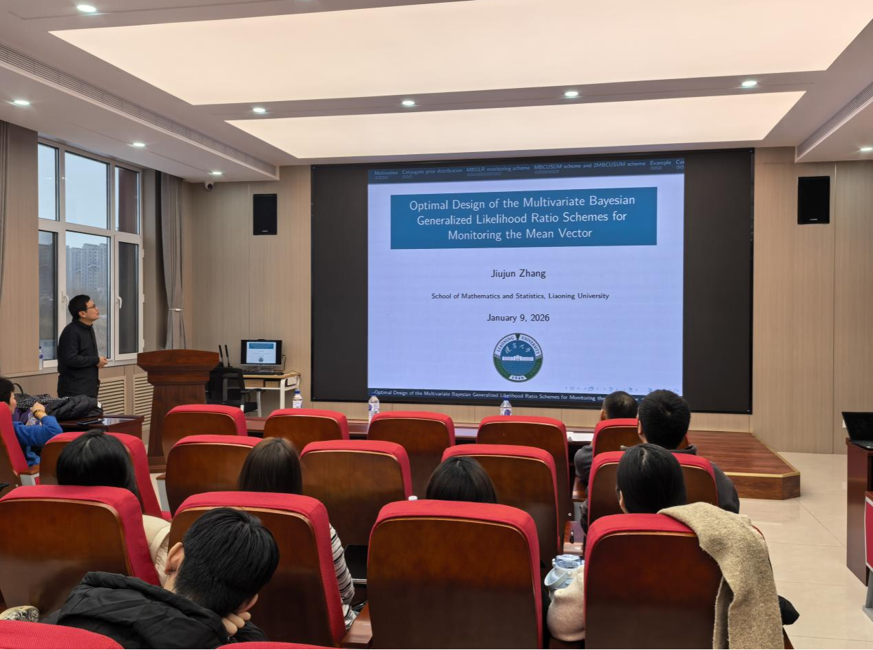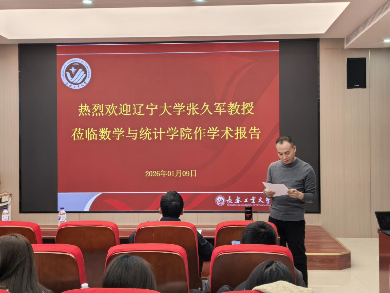 (通讯员:王芷月)2026年1月9日下午16:30,辽宁大学张久军教授莅临长春工业大学数学与统计学院,针对多元贝叶斯广义似然比监控方案的均值向量优化设计问题,开展了一场专业且富有启发性的学术报告。本次报告由数学与统计学院承办,在北湖东校区数统新楼201室进行,会议由数学与统计学院赵志文教授主持,学院副院长杨凯、赵波老师等及学院研究生参加了本次学术报告会。