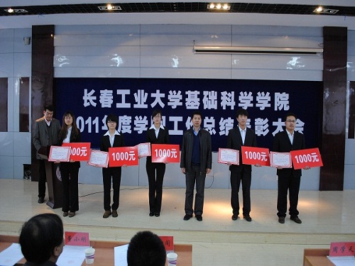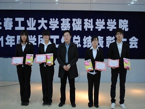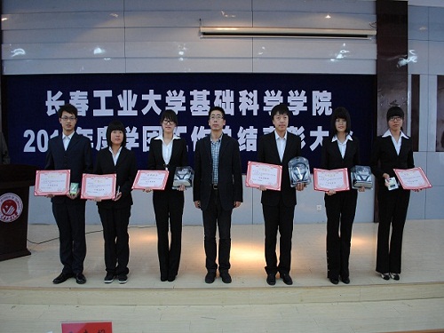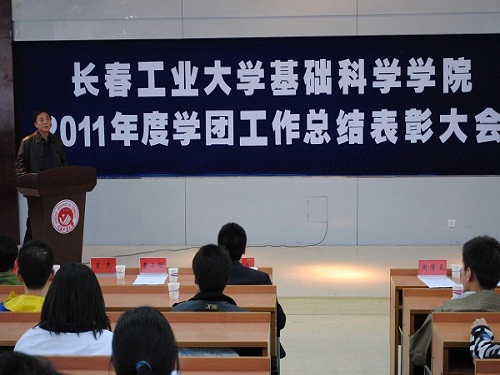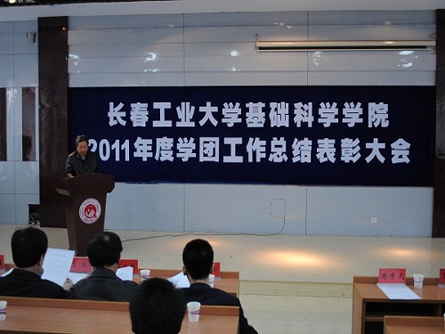 | 我院举行2011年度学团工作总结表彰大会 基础科学学院团委讯(通讯员 李雪 孙鹏)4月11日下午13:00,基础科学学院2011年度学团工作总结表彰大会在南湖校区综合三举行。学生工作处处长王春阁,组织部副部长、组织员办公室主任兰民、学生工作处副处长、大学生就业指导中心主任杨文龙,学生处副处长郭世强,校团委组织部长范琳琳,吉林省安德工贸有限公司总工程师周学天应邀出席活动。学院党委书记贾岸平,院长董小刚,关工委常务副主任孙长春,副院长闫一功、韦韧,党委副书记胡刃锋以及各学院主要学生干部参加会议。大会由基础学院团委书记谷阔主持。