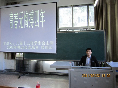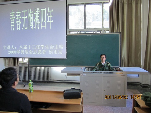 基础科学学院团委讯(通讯员: 蔡兴莹 李雪)为了让大一新生更好地适应大学生活,9月22日14:30,基础科学学院于团校203室举办“青春无悔搏四年”讲座。学院党委副书记胡刃锋应邀出席,讲座由八届十三任学生会主席、2008年奥运会志愿者侯雨辰同学担任主讲。