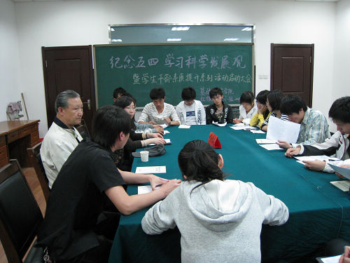 基础科学学院团委讯(通讯员 张钊)5月4日晚18时30分,基础科学学院在基础科学学院学生工作办公室举行纪念五四·学习科学发展观活动。基础科学学院关工委主任李云镐老师应邀指导本次活动。学院青年马克思主义培养班全体成员、红旗理论小组全体成员及06级主要学生干部参加此次活动。活动由学院团委副书记张婧主持。