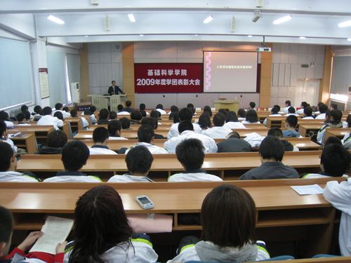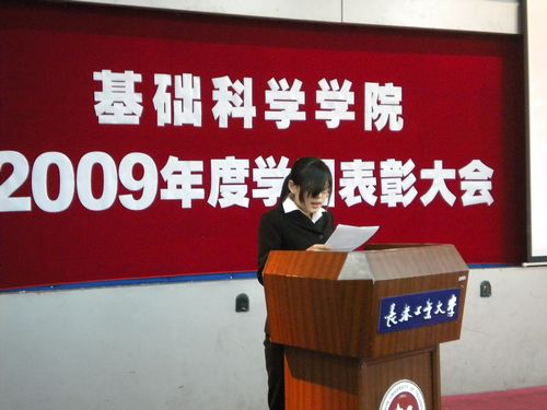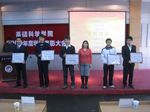 大会首先在庄严的国歌声中拉开了帷幕。基础科学学院党委副书记兰民宣读了表彰决定。2009年度基础学院有21个集体和53个个人受到了表彰,然后由领导和嘉宾为获奖的集体和同学代表进行了颁奖。会上还表彰了2009年度校“每周一题”活动的获奖同学,我院十佳大学生代表段玉维同学进行了发言。最后,基础科学学院院长董小刚进行了总结性讲话。大会在热烈的掌声中圆满结束。会后还邀请了吉大教授、博士生导师杨印生为基础学院全体学生做了题为“走向成功”的报告会。