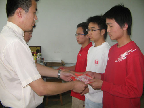 基础科学学院团委讯5月12日,四川省汶川县发生了“8.0级特大地震”,我院9名来自灾区的同学家庭受到了不同程度的损失,为了减轻来自灾区同学在生活上的压力,我院党支部副书记兰民与院团委书记谷阔代表学院向家庭受灾严重的同学代表发放了300元的慰问金,希望受灾同学安心学习,将暂时的悲痛化为学习的动力,将心思主要放到期末复习中,争取以优异的成绩回报老师的关心,让家人放心。
