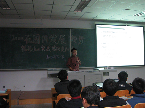 会上,刘铭老师首先就Java的背景材料、发展优势、发展历程、发展趋势进行了祥尽的分析。杨平老师就Java的发展需要性,如何对待Java作了细致的阐述。随后还召开了“铭杨Java实践基地见面会”。