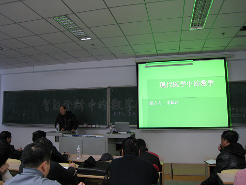 会上,李德昌教授谦逊的介绍了自己在数学和计算机学科上的发展历程,并就现阶段的主攻目标—— “现代医学中的数学”做了系统的介绍,针对医学研究中的数学问题、医学数学观点、数学进入医学各领域的情况等与我院专业息息相关的问题做了详细讲解。李教授还将自己在实践中所得的经验和体会毫无保留的拿出来与大家分享,其机智严谨的学术作风赢得大家的阵阵掌声。